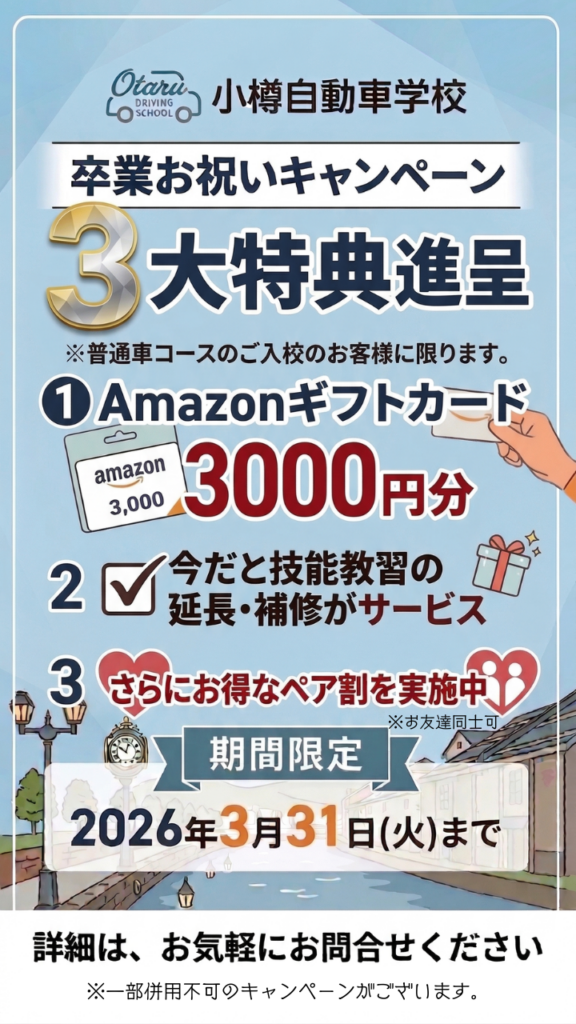 【最大3大特典】小樽で免許を取るなら今!3/31迄の卒業お祝いキャンペーン