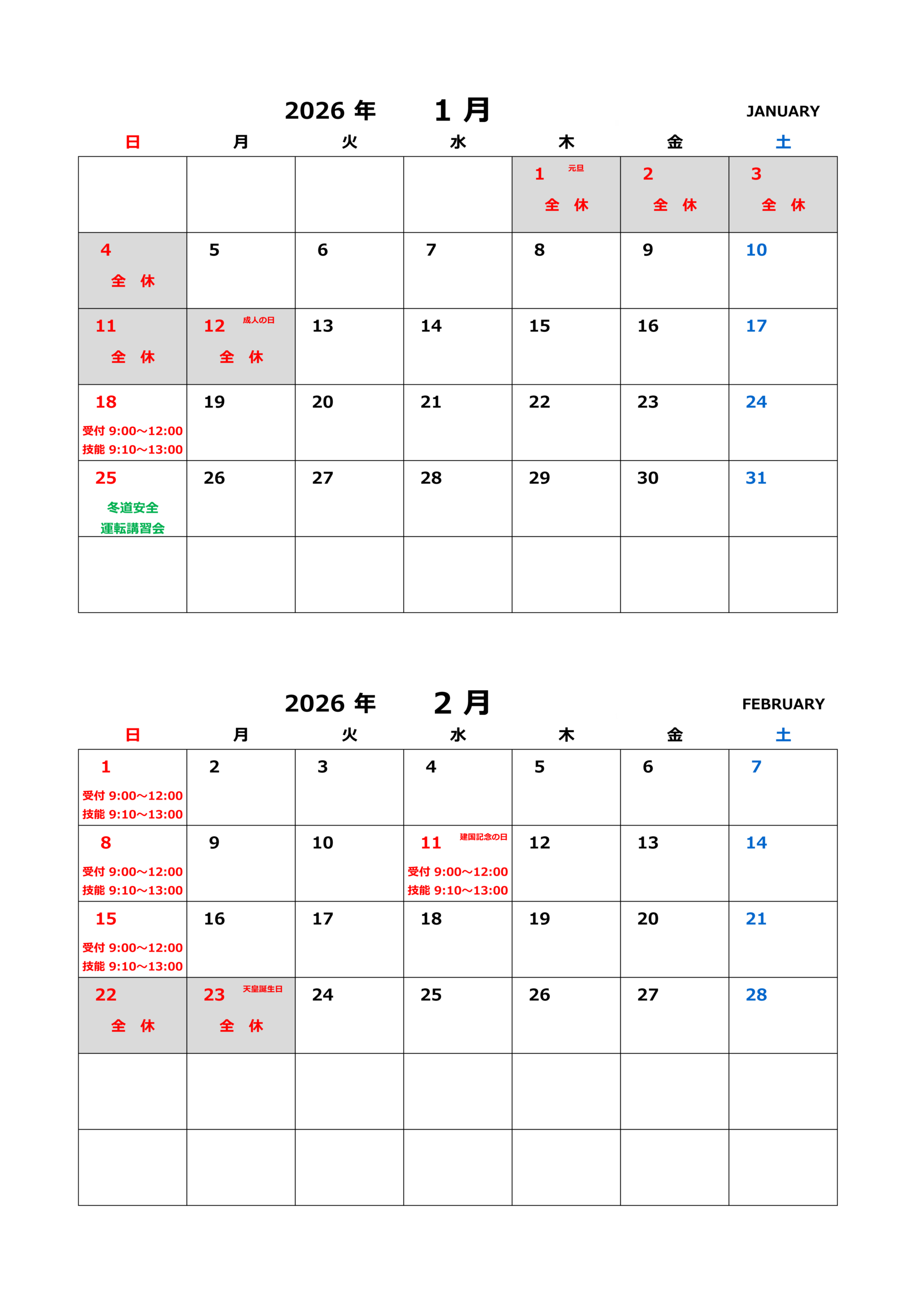 1月・2月 営業日のお知らせ