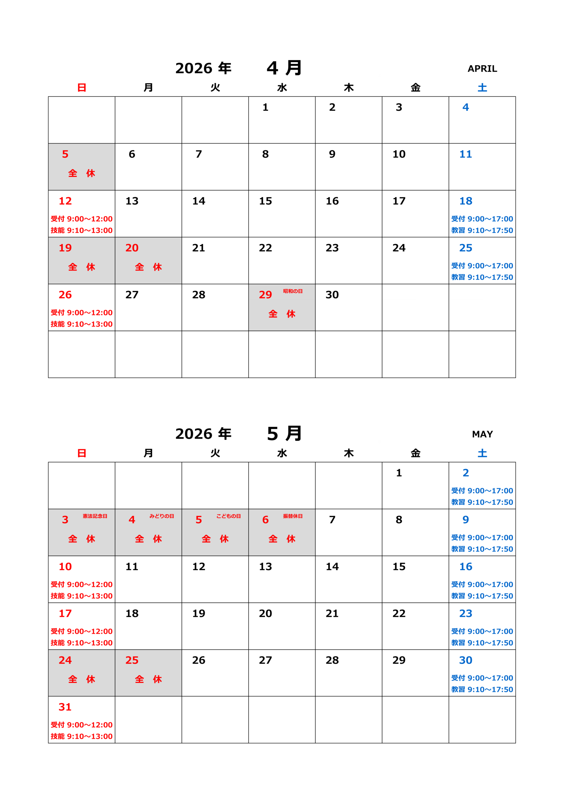 4月・5月 営業日のお知らせ